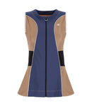 Features: a mix of performance fabrics create a colour block effect with shiny slub antique pink at the sides and back, a black waistband, violet blue collar and front inserts, and pearl white for the piping and edging